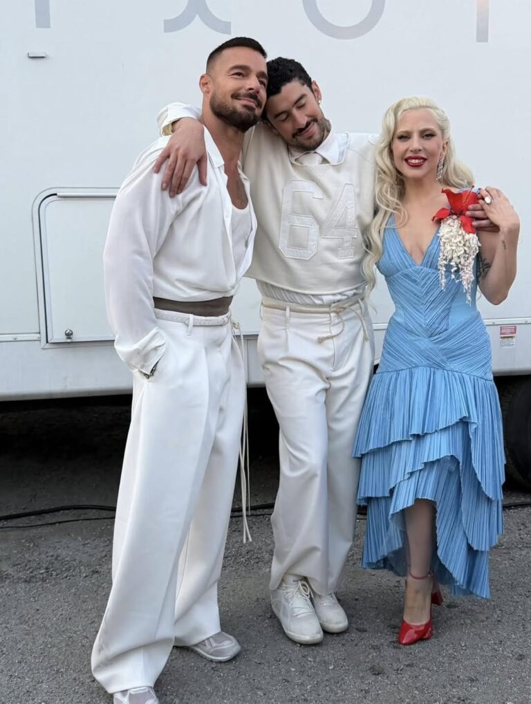 En cuanto a moda, el look de Bad Bunny esta vez no fue Gucci ni Prada, sino Zara. Un estilismo minimalista, monocromático y blanco que combinó elegancia con un aire deportivo. Chile también estuvo presente en el diseño, ya que Diego Cajas, diseñador chileno que forma parte del taller Luar, participó en la confección del vestido celeste de Lady Gaga.