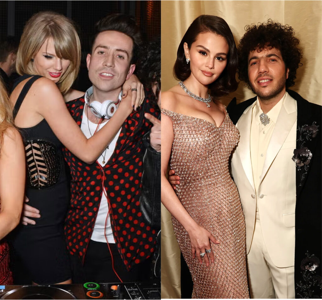 Taylor Swift con Matty Healy y Selena Gomez con Benny Blanco. Foto: Getty Images